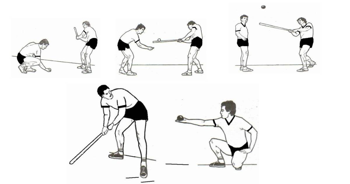 c) Dupa lovirea mingii cu bastonul, jucatorii de la „bataie” vor trebui sa intre în teren, pentru a parcurge cele doua culoare (de ducere si de întoarcere) aparandu-se* ca sa nu fie loviti de jucatorii adversi care incearca sa-i tinteasca cu mingea.